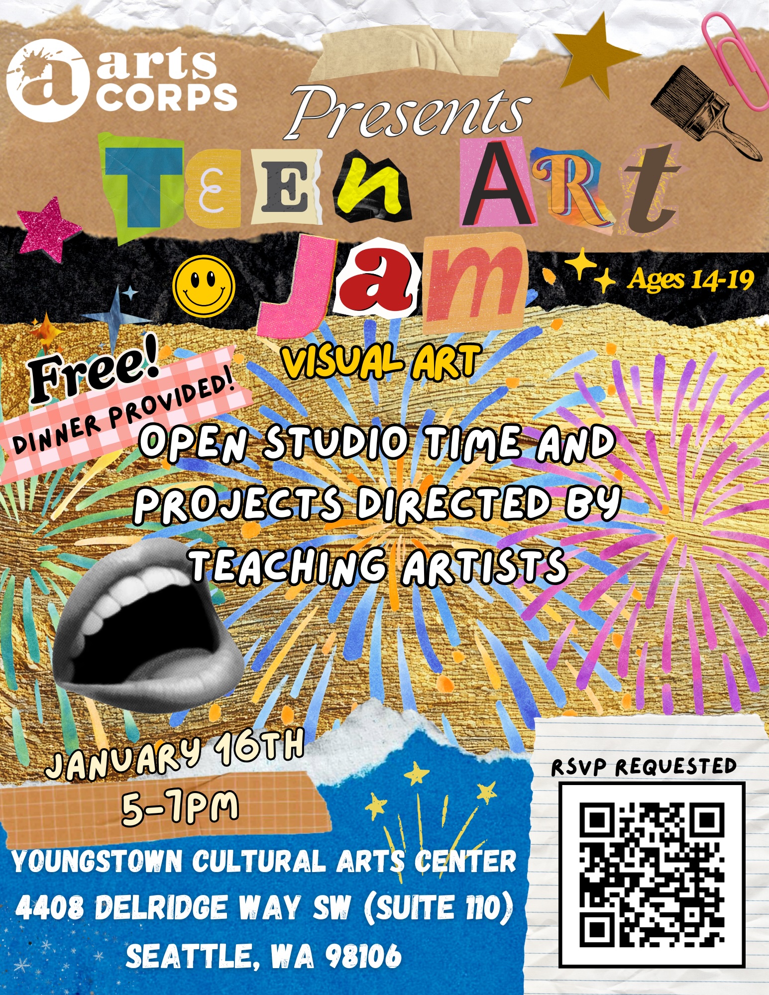 Teen Art Jam is Arts Corps’ visual art, in-house open studio program. Teenagers 14 to 19 years old are welcomed into the Arts Corps office every second Friday of the month, 5:00-7:00pm. Students are welcomed to bring their own projects and ideas or can participate in an activity led by Teaching Artists. The activity will change from month to month. Art supplies and dinner are provided.